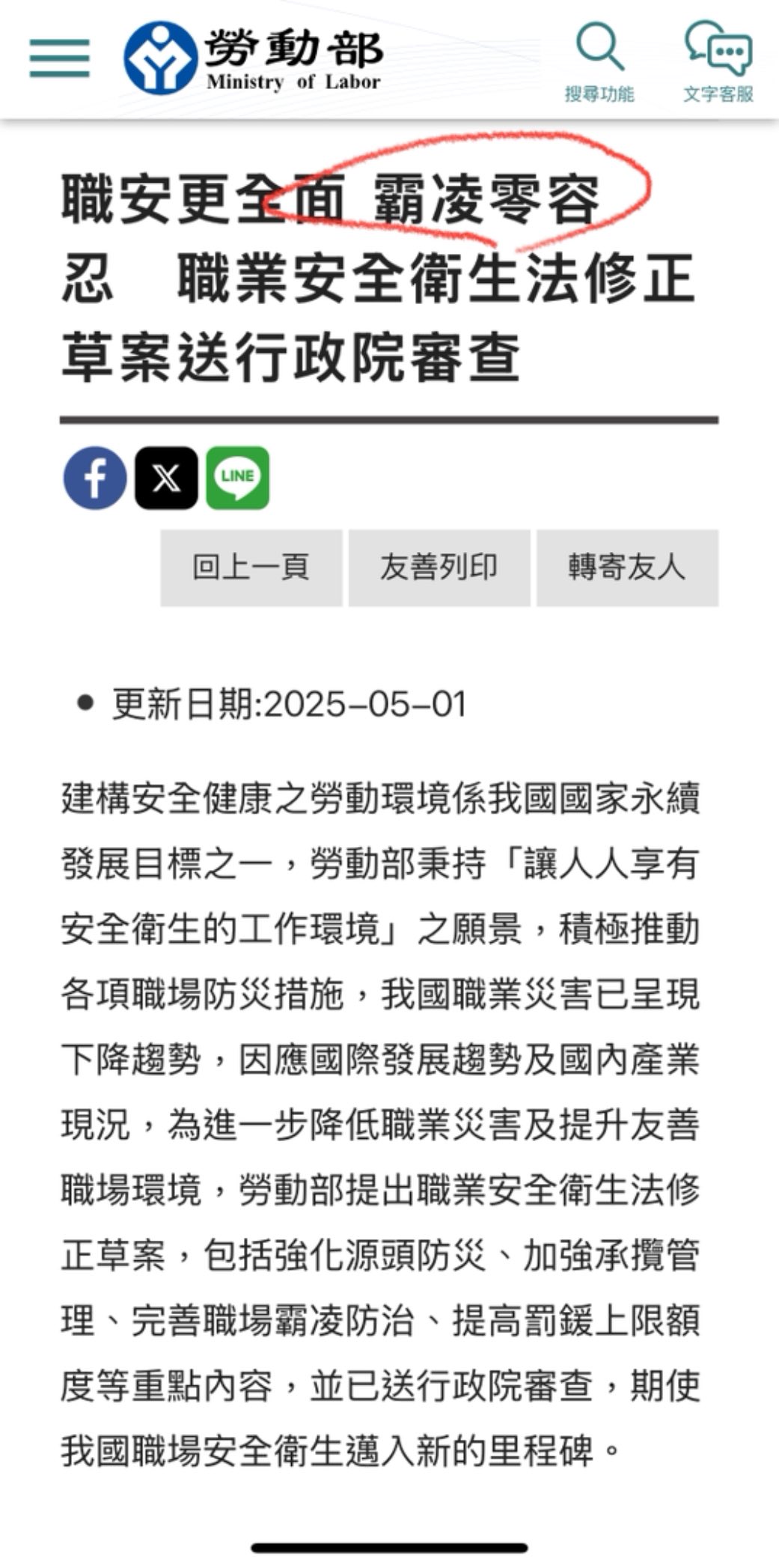 不過,勞動部目前也直接提出職安法的修法草案,直接在職安法裡定義職場霸凌,畢竟正本溯源才是王道啊!